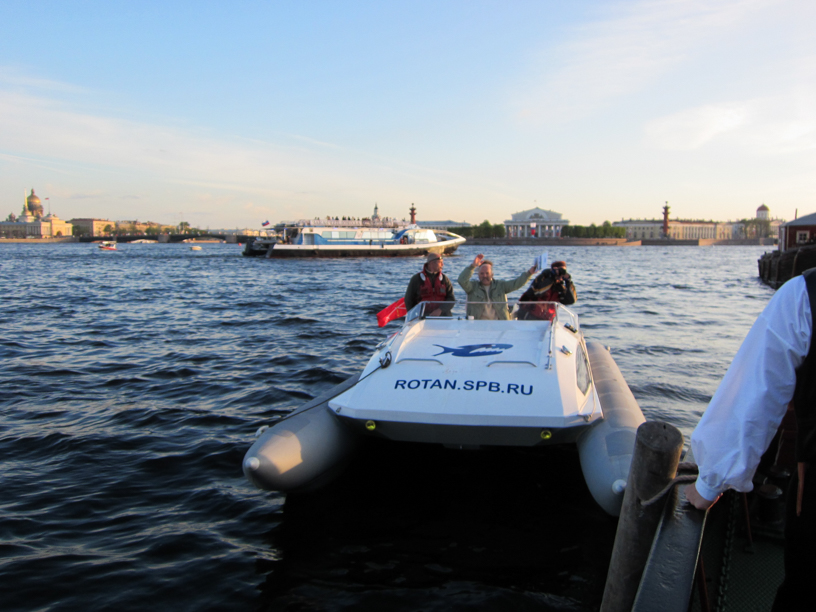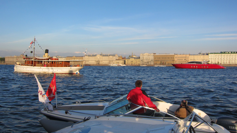 The transportation between the steamers in the roads and shore was operated by rib-boats and one had to order a ride by walkie-talkies given to us by the organizers. At first, it took quite a while waiting for the lifts. After a lot of waiting, we realized that it was a good idea to treat the transport crew with a little bit of food and drink. Suddenly, the waiting times were much shorter. Strange thing. Although it has to be said that other steamboats seemed to have realized this as well—or perhaps the transport crew had their own drinks, too—because in the late night we saw one of the crew members falling from the rib-boat to the river Neva for a short swim. After we realized that they got him up, we had a good laugh.