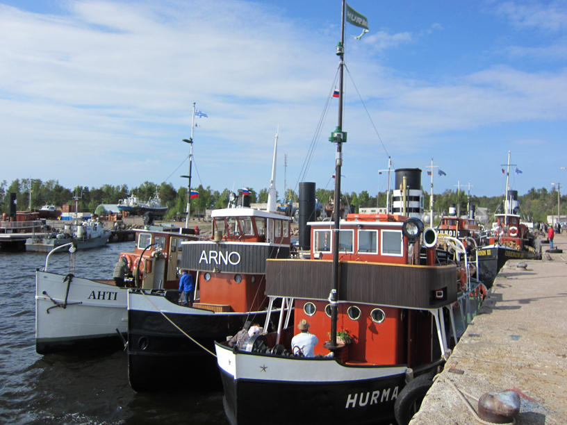 The morning arrived with a clear but quite cold weather. The day started with a ‘skippers’ meeting’ aboard steamboat Turso. Turso was given to the Soviet Union in 1944 as part of the war reparations agreed on the peace agreement. Turso was active as a harbour ice-breaker in Leningrad until it was bought by Finnish steamboat enthusiast back to Finland. For Turso, this was a visit back to the former homeport. But back to the point: in the skippers’ meeting discussed the planned route of the day, the VHF channels that would be used and so on. The idea was to steam by the inner route protected by islands to fishing port of Primorsk (old Finnish name: Koivisto). All this was told to us by our Russian organizer and chief of the event, Sergei. He was the right man in the right place: he was giving advice to us and was working all around—now in the skippers’ meeting sometimes aboard ribboat or driving tractor or a car. Especially one of his expressions has entered my vocabulary: “more or less”. “The anchoring area should be more or less there”. Very useful and handy for any purposes!