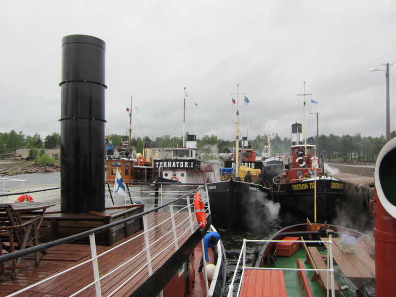 The funnel of steamboat Hurma (with three stripes) visible furthest back. In front steamboats Puhois and Saimaa.