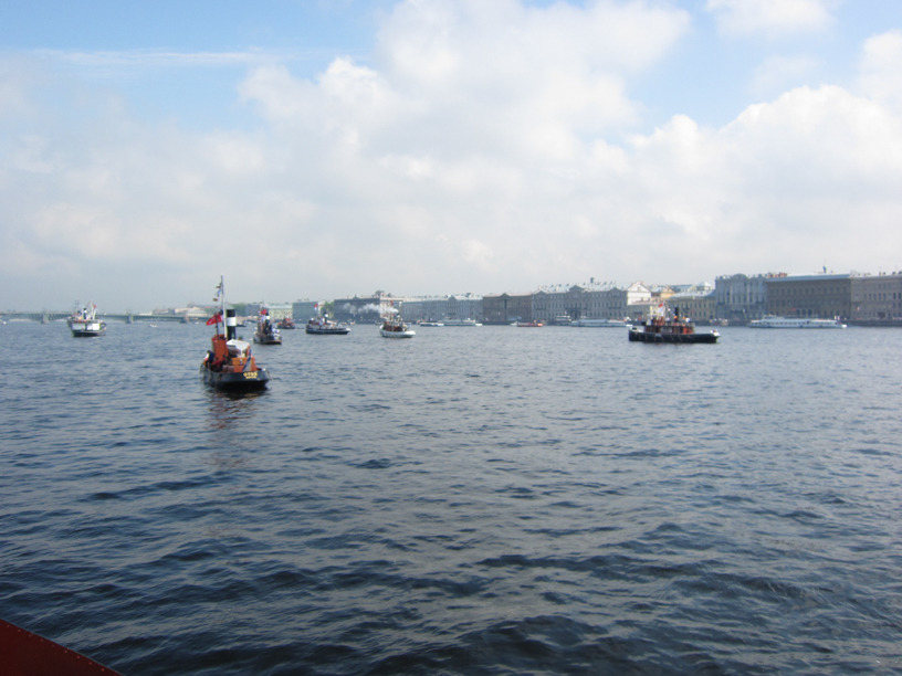 First thing in the morning we had a skippers’ meeting on one of the steamers. We went through the program of the day once more: we would make a whistle by all ships and then a short round trip on the Neva. After the meeting the clouds parted and sun came out. Afterwards there was a lot of talk about the so called Moscow Olympics effect: it could not be raining during celebrations… In any event, the parade was steamed in a perfect weather!