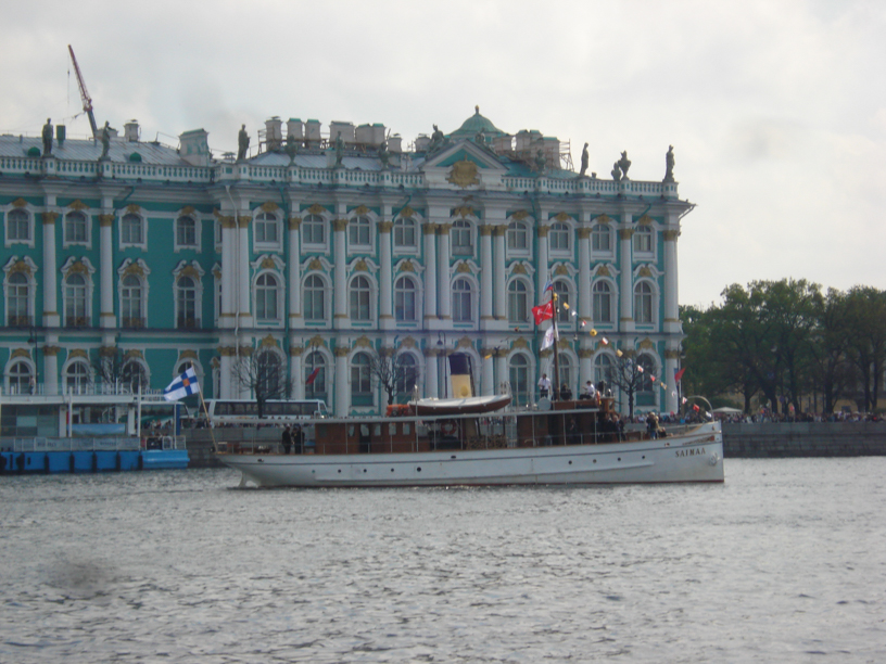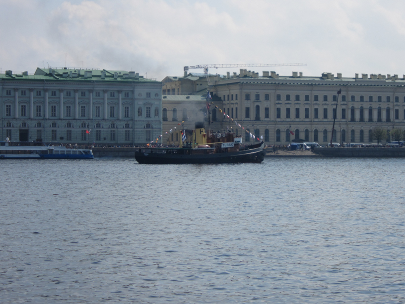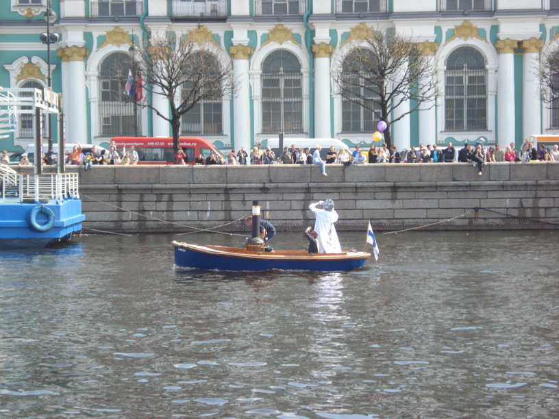 As the Friday evening approached and the bridges of the river Neva would open (they normally open the bridges for a couple of hours at night to let the ship traffic pass), it was time to sail to the Neva, to the area where the celebrations would take place. On the river Neva, it was obligatory to have a pilot* aboard regardless of the size of the steamer. Normally it was needed only on vessels over 24 meters of length but on Neva foreign ships were not allowed to sail without a pilot. Someone even told us, that the permission to our regatta was given by the prime minister Putin himself. In any case, our pilot was a real gentleman and mostly just watching us doing our work: and sometimes just asking politely: ”Please, take little bit to the right, sir”. The current on the Neva was really strong so the obligatory measure of having a pilot aboard was a reasonable one. Of course, it had to be said that not all the steamers had such gentlemen as we: on one steamer, the pilot was ’fully loaded’ all the trip. But that makes it an experience as well…